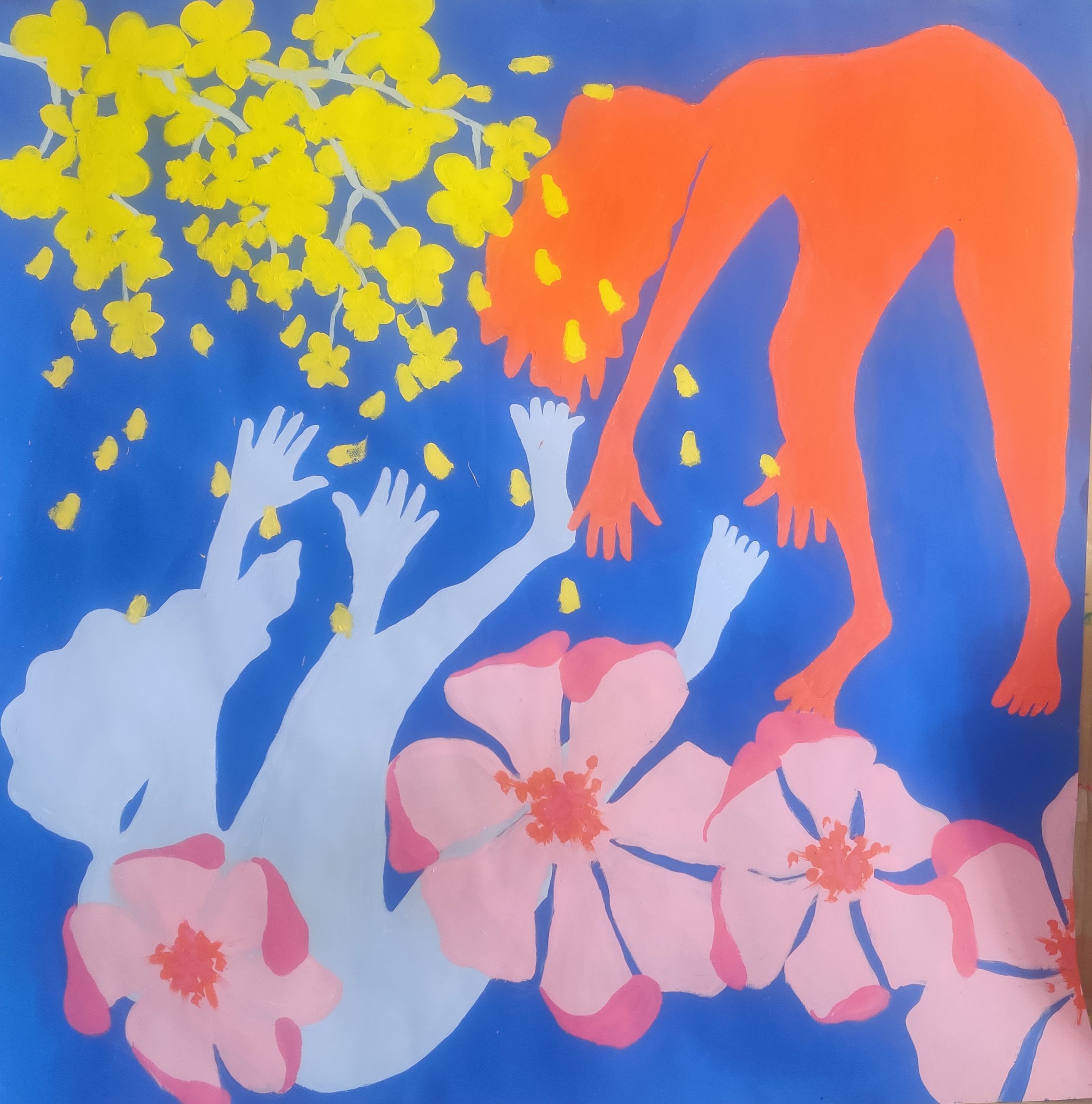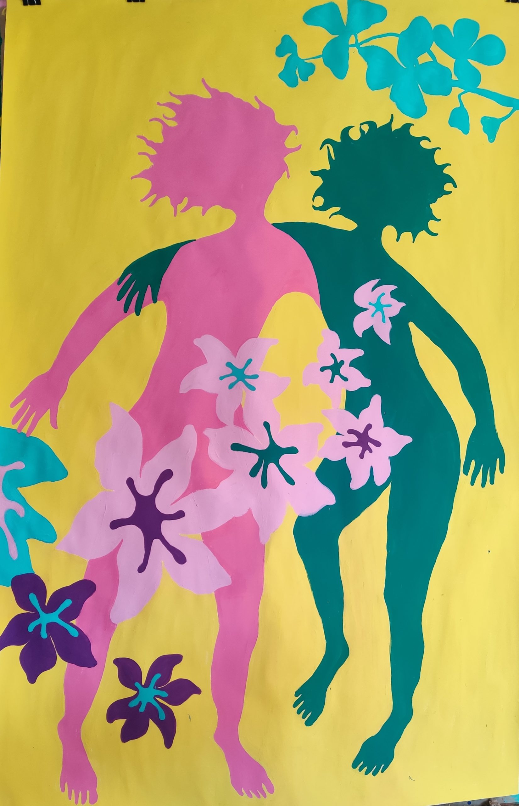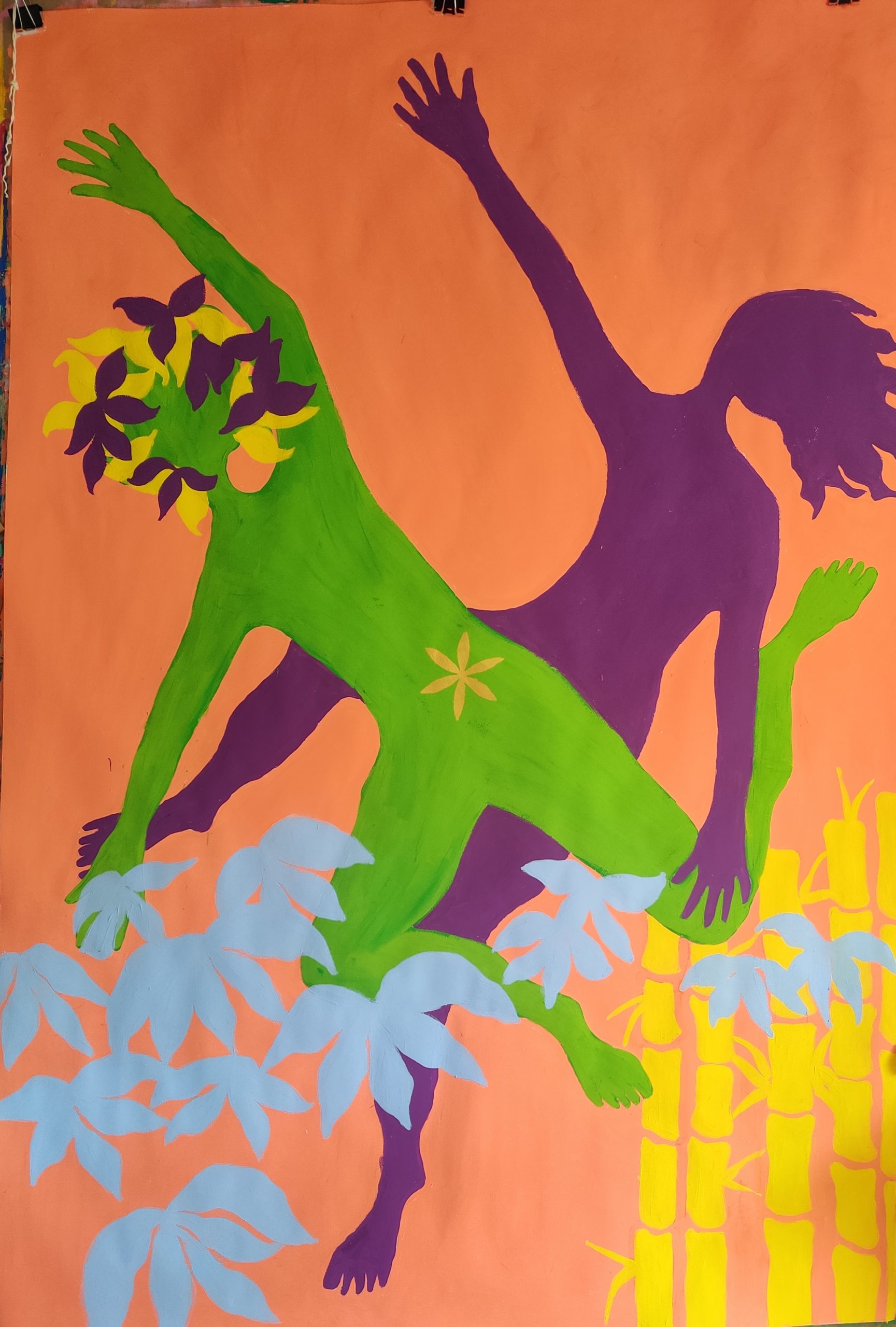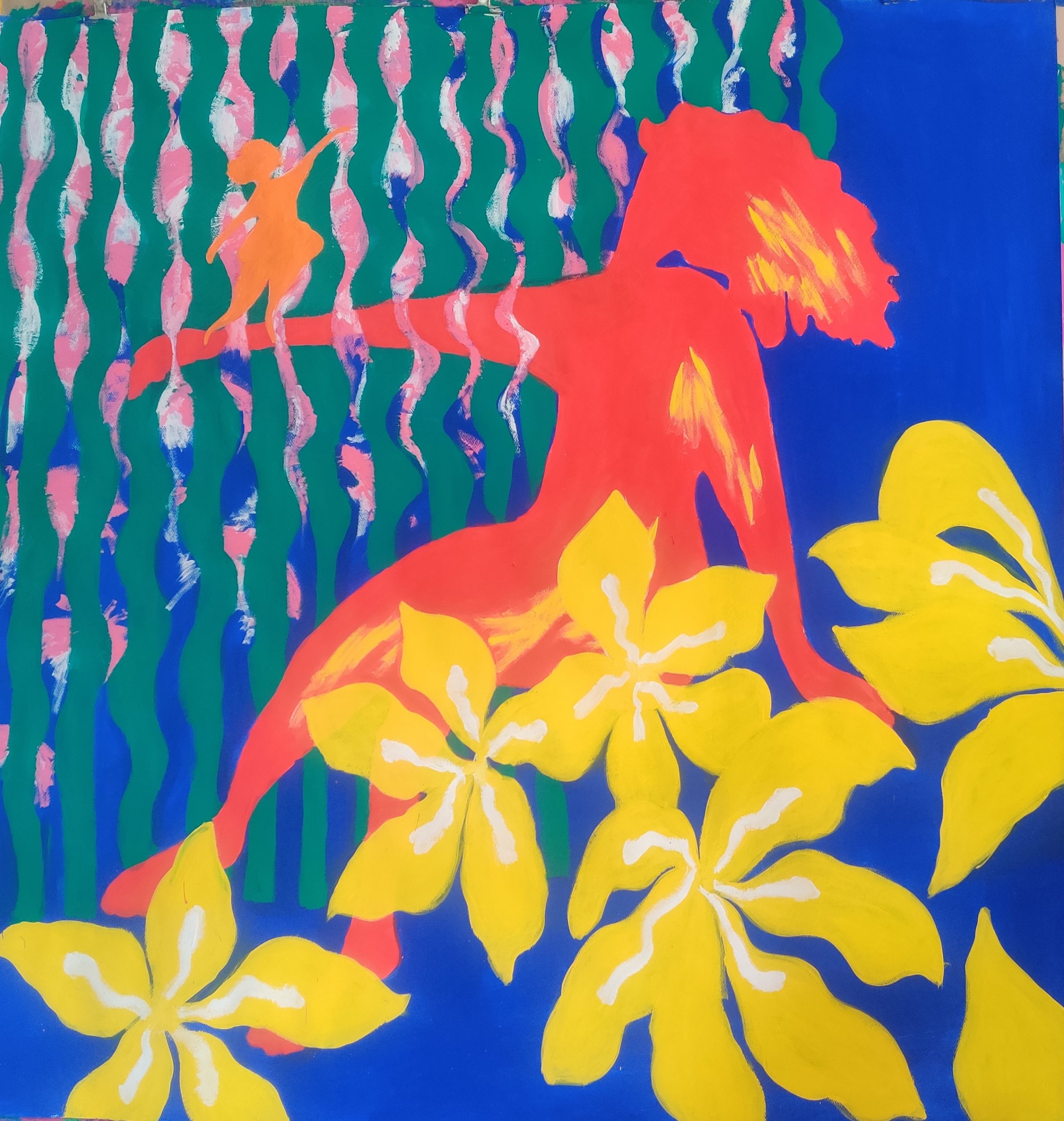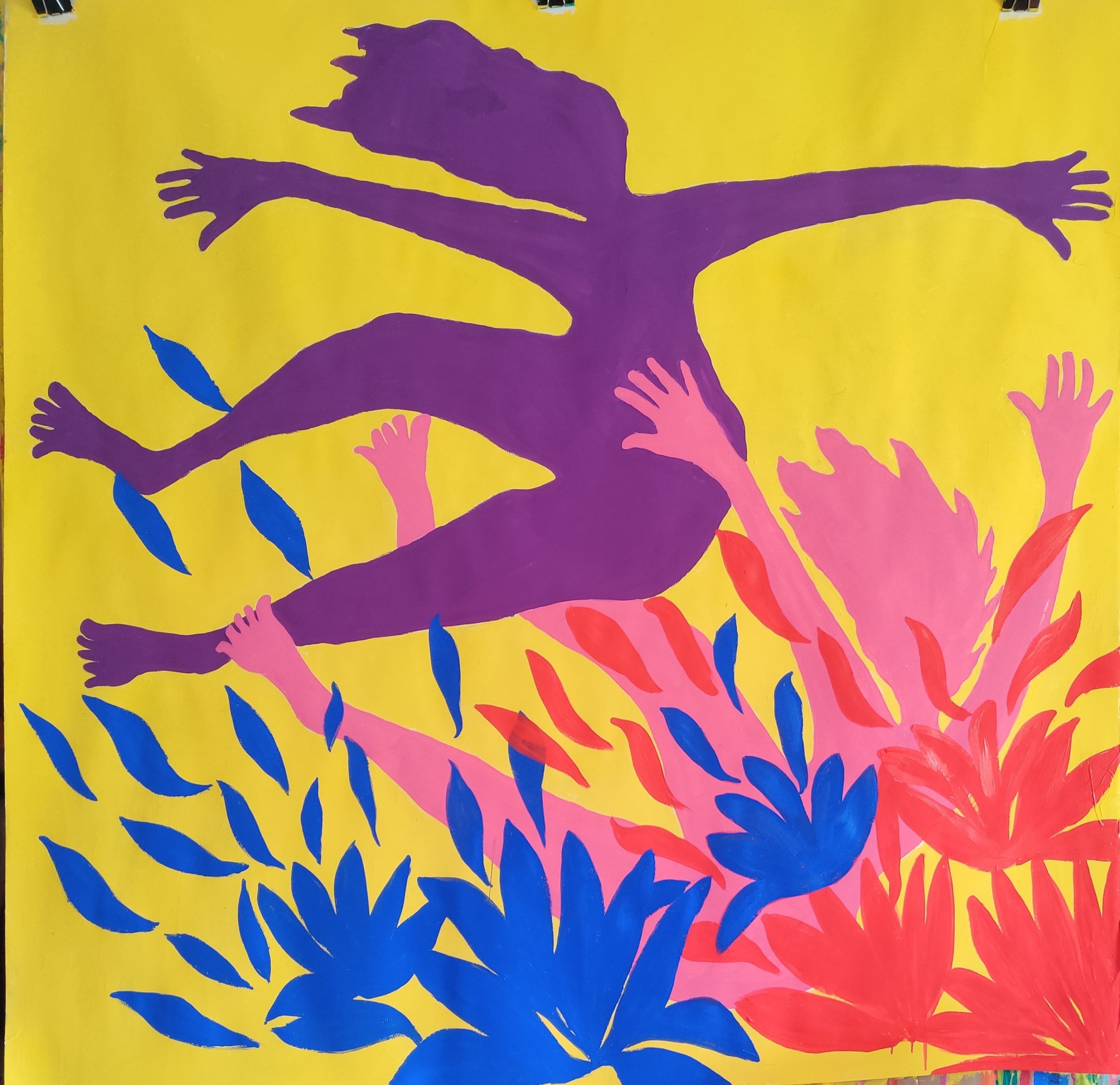 Les Envolées sont de grands formats, reflétant les corps grandeur nature, peints à la gouache aux pigments naturels sur papier à fort grammage. J’utilise la gouache car elle est pour moi un moyen d’expression simple et direct, comme lorsqu’on était enfant, spontanéïté, émerveillement.
