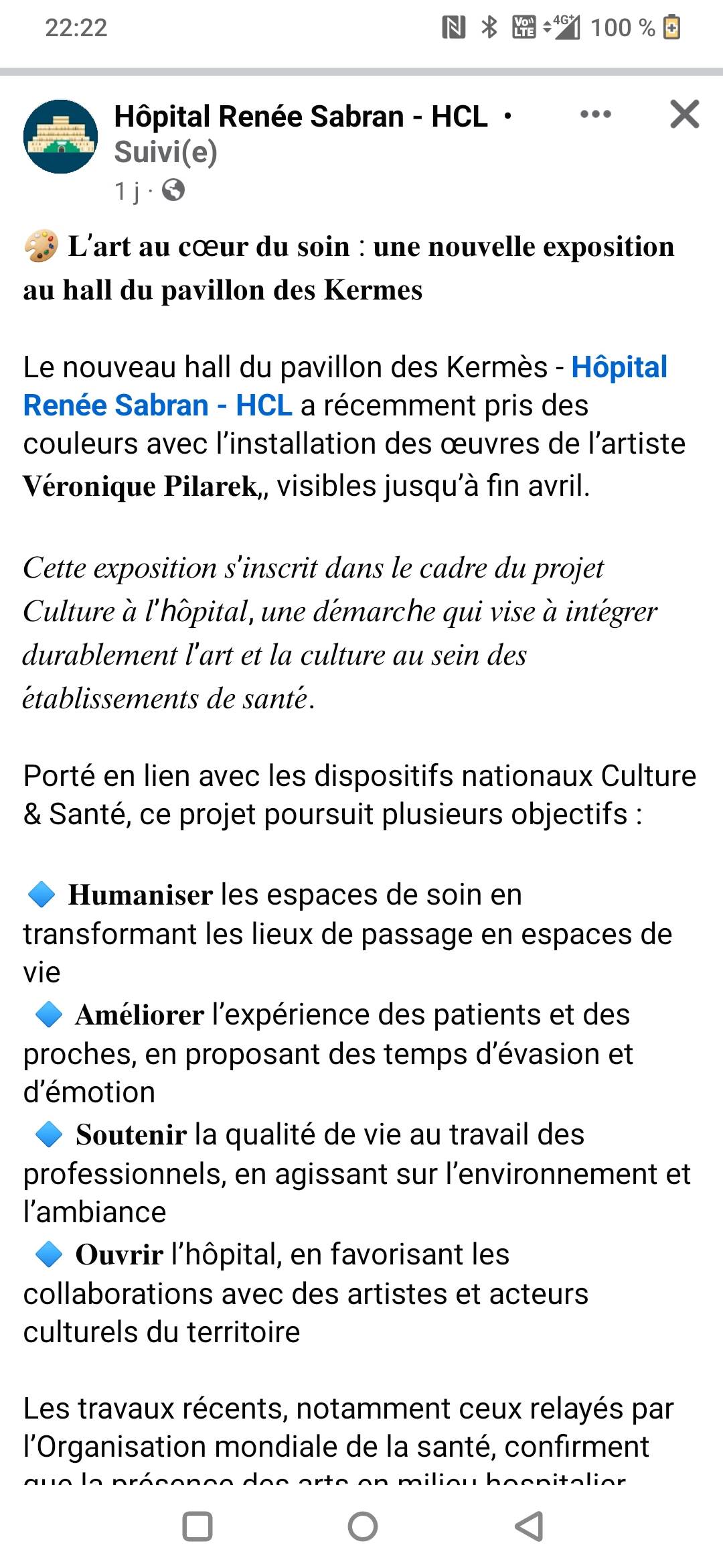 Inspirée par les travaux neuro-scientifiques sur l’effet cathartique de l’art du professeur Lemarquis, le projet de proposer d’installer des peintures dans les hôpitaux varois s’est imposé à moi, tant pour faire du bien aux malades qu’aux soignants et personnels des hôpitaux. Au regard des expériences déjà menées dans les hôpitaux de Paris et Lyon, je crois aux bienfaits de l’art, par la nature des émotions qu’il véhicule, à sa capacité d’émerveillement et de mise à distance des maux en particulier,